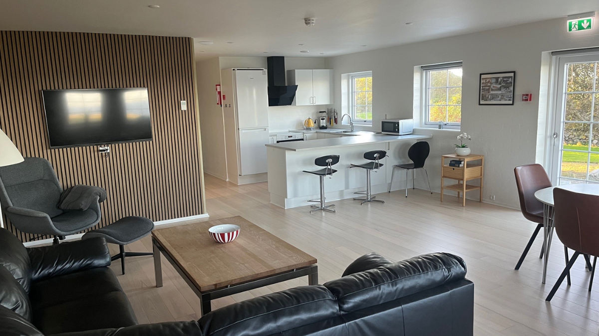 Forstanderboligen er renoveret i 2020 og fremstår lys og funktionel. Lejligheden har kapacitet til 4 værelser med i alt 8 sengepladser og indeholder eget køkken-alrum samt en opholdsstue med sofagruppe og tv. Boligen egner sig til mindre grupper, der ønsker rolige og naturnære rammer.